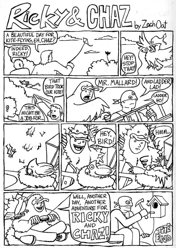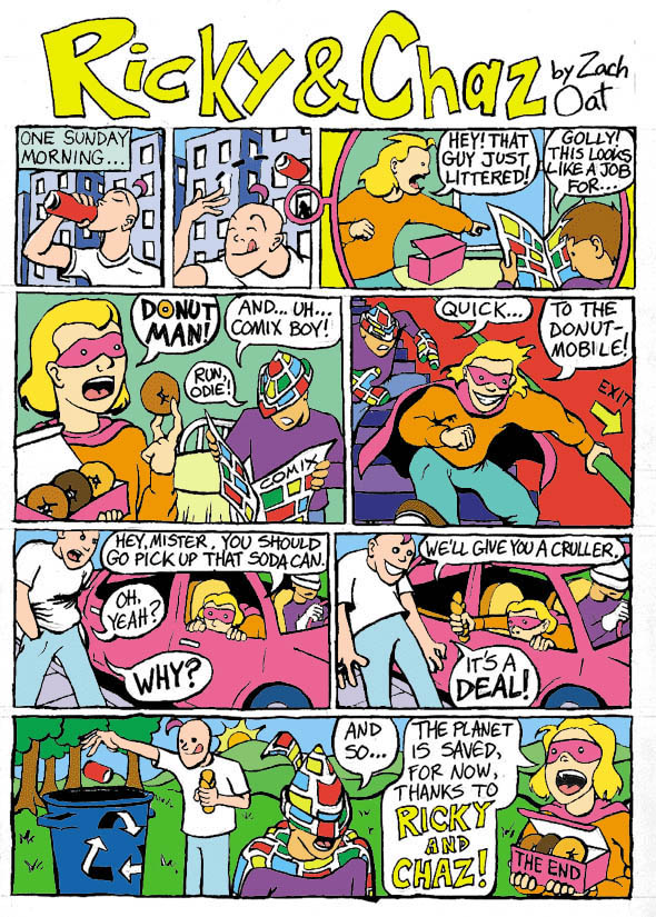 Every Ricky & Chaz episode has them dress up in superhero costumes and right some wrong. Not great opera, but something about the costume-change panel always makes me laugh. Maybe if each adventure lasted a couple of months instead of a single page, I'd have something. Anyway, click on the panel to read the strip, which is inspired by Sunday mornings sitting around the house eating donuts and reading the funnies.