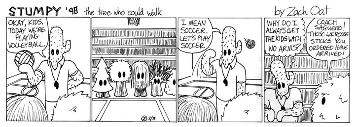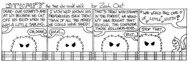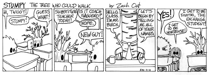 A tree in a tie makes me laugh. In fact, I love the adult trees in this strip in general, how we never see their heads, because they're so tall. How high are these ceilings, anyway? Unfortunately, no one got the "give-a-fake-name-to-the-substitute" thing; I guess it was just the evil kids at my school who did that. These kids have pretty bad names already. Stumpy? Sounds like an amputee. Twiggy? A 1960s fashion model. Willow? Actually, I like that name. Better than Hortense, anyway.