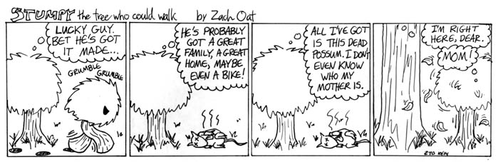 I don't know where the dead possum idea came from. It may have been part of a bet or something ("I dare you to put a dead possum in your comic strip!"), but more likely I just found the idea of a dead possum being someone's sole worldly possession hysterical… Okay, maybe it was a bet.
