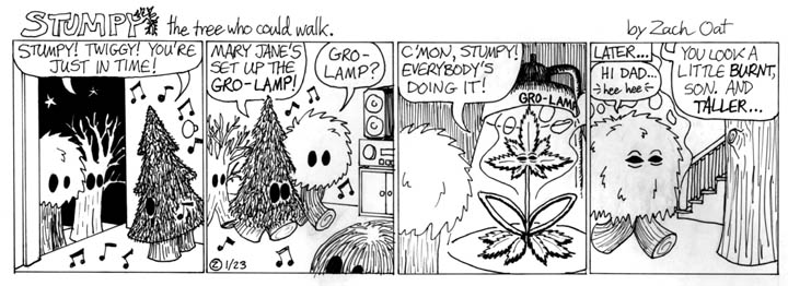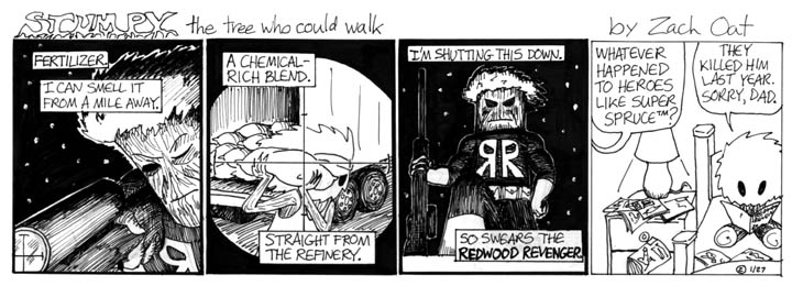 Comic book parodies overused? Say it ain't so! Nonetheless, I went ahead with this strip about the Punisher of the tree world, who even shared a costume (sort of) with the Marvel Comics vigilante. Stumpy's dad asks about Super Spruce, that world's Superman, only to find that, like our world's hero, Spruce had been killed years before. (Fortunately -- or unfortunately, depending on your views -- ours came back.) Notice that in comic books, all trees have arms. Hmm…
