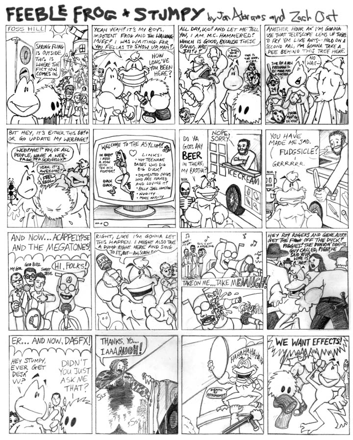 This crossover was done in the great tradition of the Captain Cardinal/Feeble Frog crossovers of 1996 and 1997. After coming up with a plot, and a general panel-to-panel breakdown, I would draw and letter my characters and Jon would draw and letter his. The first two crossovers were just general super-heroing, but the presence of a small tree-person and the introduction of Feeble's rude friend Demented Duck led the whole thing to go in a bizarre direction. Das FX did play our "Spring Fling" concert the year before and was well-received, although most of us were under the impression that the band had broken up in 1992. The ice cream man is based on The Ice Cream Man, who was a fixture on campus for most of my time at Wes. He always parked in just the right place to cater to a class on break or an ultimate frisbee team with the munchies. The skeleton in line is one of Feeble Frog's villains, an Irish skeleton whose name eludes me. Acapellypse was a character I created for Captain Cardinal, megaphone and all, and he's singing "Take on Me," by A-Ha, a song my acappella group used to do. The kid getting the bat early in the strip is a freshman named Nicky, who wrote an obnoxious column called "I'm Da Man," that managed to annoy pretty much everyone on campus. Guest Appearances: Captain America in panel two, a werewolf in panel three (Jon likes werewolves), Jon's Larry the Ladybug in panel five, actor Robert Loggia (as a backup singer) in panels nine and eleven, and my creation, Poor Jim, in panel one, getting brained by a frisbee, as always.