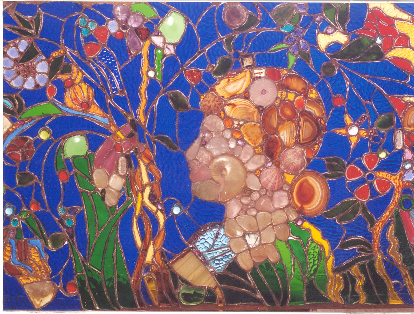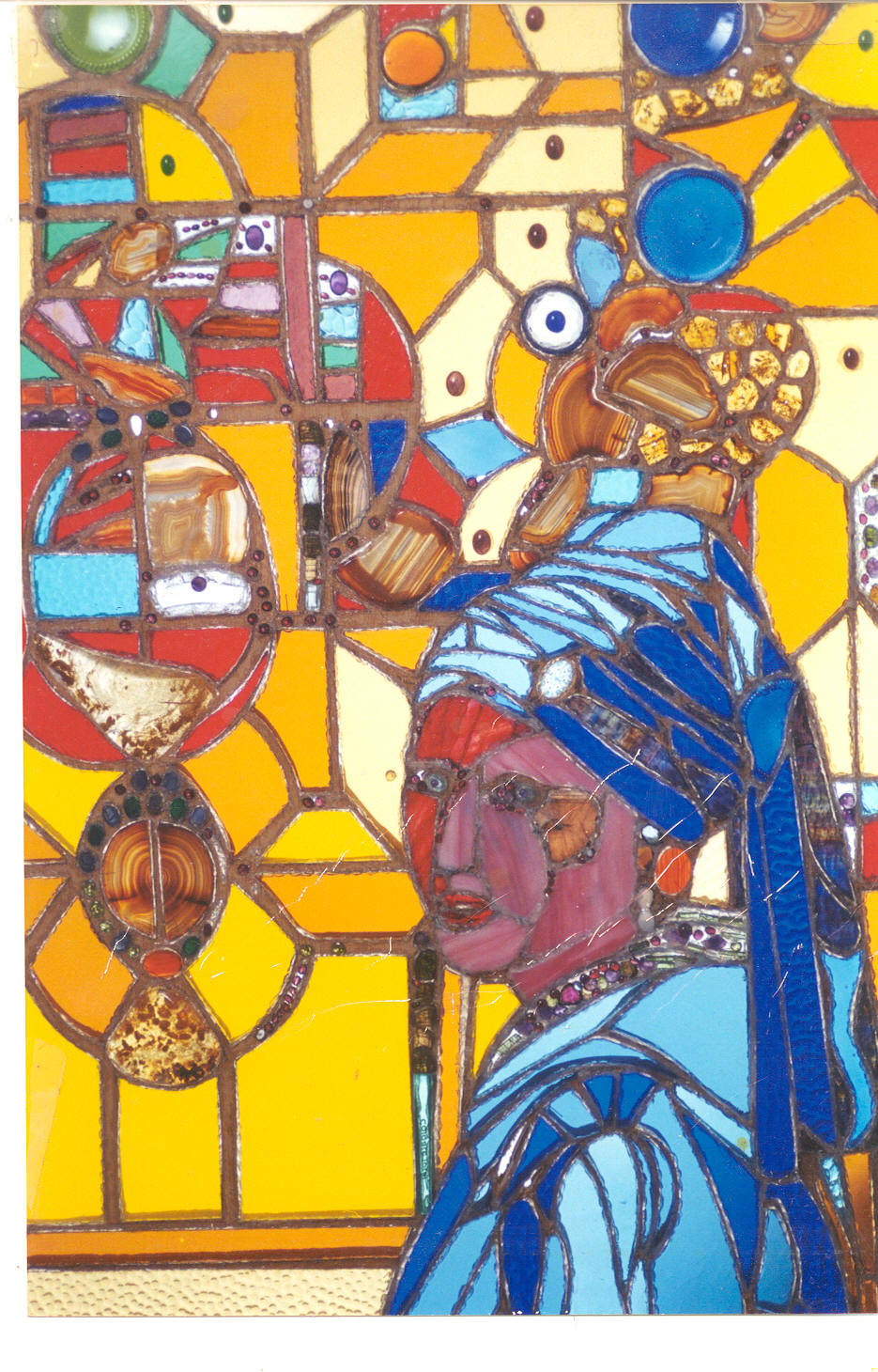 For years he was unable to find the time to put the concept into practice. The chaos of life - joining the Navy, raising my sister and me, and various other situations both happy and not so happy - conspired to keep him from doing anything. In 1989, he began his first experimentations with stained-glass windows. By the mid-1990's, he was doing serious work, using semi-precious stones like agate and tormeline, as well as found objects (e.g. beer bottles), guitar picks, and in general anything which was translucent.