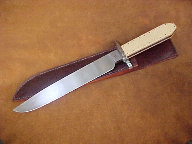 G4CHB803 Coffin handled Bowie. Blade- 10" X 1/4 X 1 1/2. Overall length 15 1/4" Handle is antique ivory micarta. $475.00