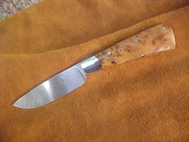G4SS803 Small Skinner. Blade length 3", overall length 6" Blade is W1 steel, bolsters are mild steel and handle is thuya burl. $110.00