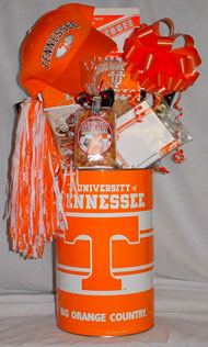 This basket is filled with Snacks just perfect for the game. We include popcorn, pretzels, cheese chips, nuts, trail mix, "Tennessee" T Cake, plus Titian gifts which include a license plate, hat, and key chain. Extra game type snacks are added to the large basket.