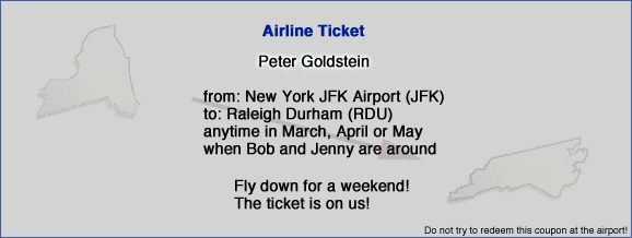 You can check for flights (direct from JFK to RDU) at Orbitz or Expedia, and you can check our available weekends here.