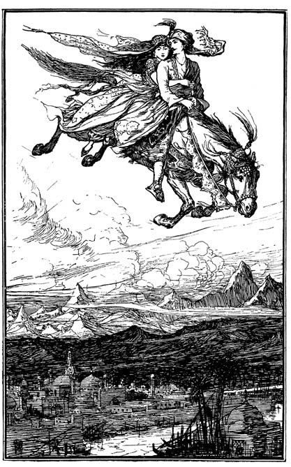 "Sire," replied the Indian, "I never doubted that a sovereign so wise and accomplished as your Highness would do justice to my horse, when he once knew its power; and I even went so far as to think it probable that you might wish to possess it. Greatly as I prize it, I will yield it up to your Highness on one condition. The horse was not constructed by me, but it was given me by the inventor, in exchange for my only daughter, who made me take a solemn oath that I would never part with it, except for some object of equal value."
