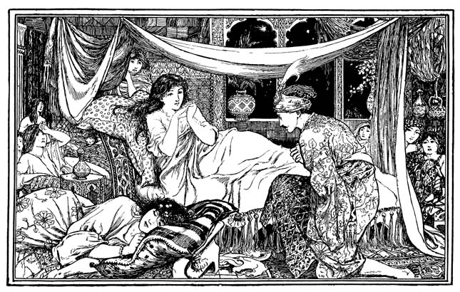 It all happened as the Sultan had foreseen, and the two brothers appeared in their sister's apartments just as she was in the act of stepping into bed, and told their tale.