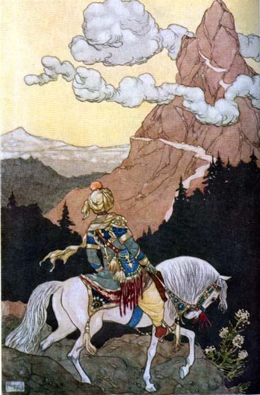 So saying the princess mounted her horse, and, declining to allow even Prince Bahman to carry the cage with the Talking Bird, she entrusted him with the branch of the Singing Tree, while Prince Perviz took care of the flask containing the Golden Water.