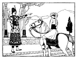 After a few days Prince Bahman and Prince Perviz fell back into their ordinary way of life, and passed most of their time hunting. One day it happened that the Sultan of Persia was also hunting in the same direction, and, not wishing to interfere with his sport, the young men, on hearing the noise of the hunt approaching, prepared to retire, but, as luck would have it, they turned into the very path down which the Sultan was coming. They threw themselves from their horses and prostrated themselves to the earth, but the Sultan was curious to see their faces, and commanded them to rise.