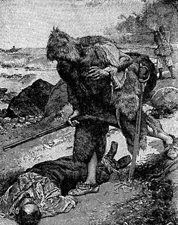 I kept my Piece in my Hand still, without firing, being willing to keep my Charge ready; because I had given the Spaniard my Pistol, and Sword; so I call'd to Friday, and bad him run up to the Tree, from whence we first fir'd, and fetch the Arms which lay there, that had been discharg'd, which he did with great Swiftness; and then giving him my Musket, I sat down my self to load all the rest again, and bad them come to me when they wanted: While I was loading these Pieces, there happen'd a fierce Engagement between the Spaniard, and one of the Savages, who made at him with one of their great wooden Swords, the same Weapon that was to have kill'd him before, if I had not prevented it: The Spaniard, who was as bold, and as brave as could be imagin'd, though weak, had fought this Indian a good while, and had cut him two great Wounds on his Head; but the Savage being a stout lusty Fellow, closing in with him, had thrown him down (being faint) and was wringing my Sword out of his Hand, when the Spaniard, tho' undermost wisely quitting the Sword, drew the Pistol from his Girdle, shot the Savage through the Body, and kill'd him upon the Spot; before I, who was running to help him, could come near him.