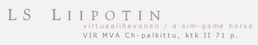 ![]() LS Liipotin Kutsumanimi: Lippe, Liippa Syntynyt: 20.1.2003 (10 v.) Rotu: suomenpienhevonen Sukupuoli: tamma Säkä: 140 cm Väri ja merkit: kanelinrautias hamppujouhilla Kasvattaja: Linne's Stud/Ida L. Omistaja: Toukolan Tila/Ida L. Rekisterinumero: SHRt-734 (Suomenhevosrekisteri) Re 100cm, Ko He A |