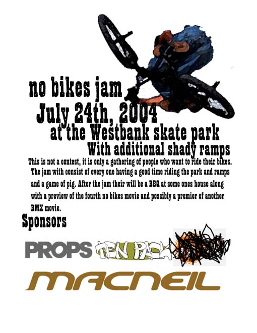 Other news. We want to get the fourth no bikes movie really good so we are posponing it untill septembr so look for a permier dat around then. planing for the jam is going good terrible one, tenpack distribution and props are the only sponseres so far but that is plenty. i have acumulated a large pile of 2X4 for gehto ramps so there will be some surprise extras there. And possibly a bbq after at one of the locals houses and a teaser for the no bikes video, possibly a permier of a nother video.