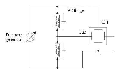 Ziel der Messung ist es, das Frequenzverhalten der Widerstände aufzunehmen. Zu diesem Zweck werden sie einfach in Serie an einen Frequenzgenerator angeschlossen. Mit dem Oszilloskop wird die Gesamtspannung und der Spannungsabfall an einem Widerstand gemessen.