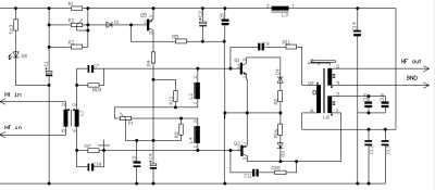 Die Hochfrequenz der Vorstufe gelangt auf den Eingangstrafo L1 und wird an dessen Sekundärseite frei vom Massebezug symmetrisch auf beide Transistoren aufgeteilt.