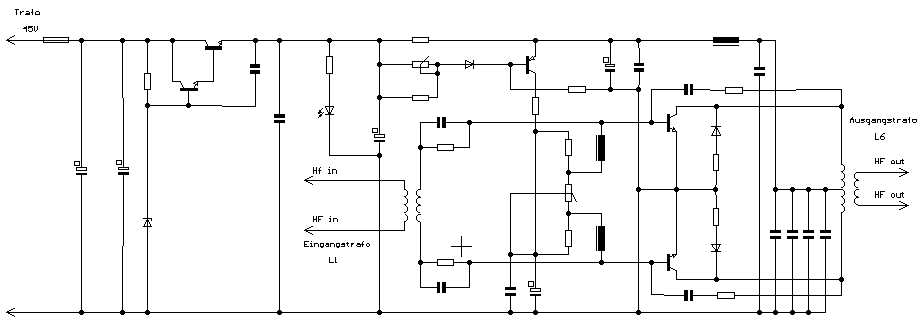 Über C13,C14,C15,C16 und C17 wird die HF gegen Masse abgeblockt. L6 ist ein Übertrager mit zwei Spulen, die so angeschlossen sind, dass sich der Gleichstrom durch beide Spulen zu Null addiert. Dadurch wird die Belastung des Magnetmaterials erheblich verringert. Aus diesem Grund ist es sehr wichtig, dass beide Spulen unmittelbar nebeneinander, eben bifilar verlaufen, da sonst eine teilweise Sättigung des Magnetmaterials auftritt. Zusätzlich hat eine solche Spule noch den Vorteil, dass sie als Trafo arbeiten kann und so für alle geradzahligen Oberwellen die Kollektoren beider Transistoren kurzschließt.