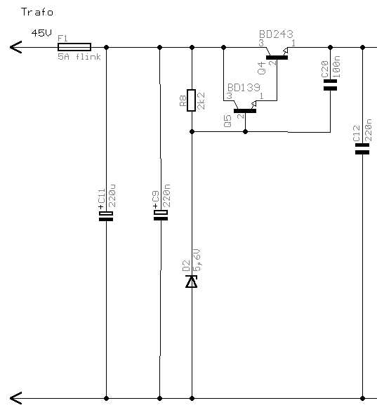 Der Kondensator C18 dient zur Glättung der Betriebsspannung. Die Kondensatoren C17 und C06 sind Entstörkondensatoren. C03 unterdrückt die bei der Spannungsregelung auftretenden Regelschwingungen. Transistor T02 und T03 bilden eine Darlingtonstufe. Bei schwankender Ausgangsspannung wird über die Masche Uz = UBE + Ua Ua konstant gehalten, da die Basis- Emitter Spannung durch den veränderten Basisstrom variiert.