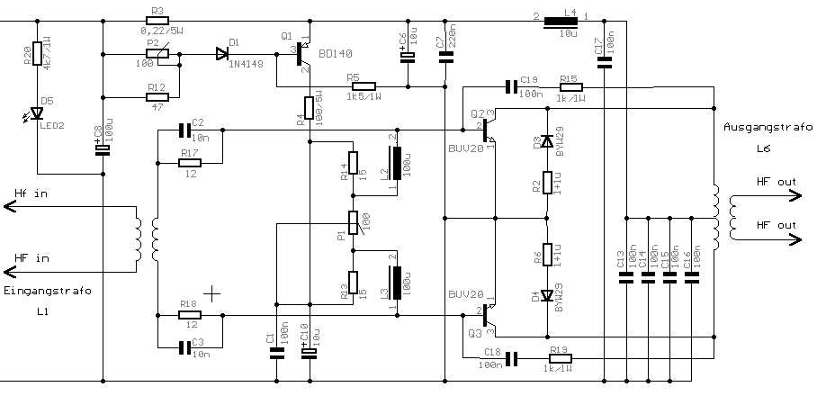 R17/C2 und R18/C3 heben die hohen Frequenzen zur Kompensation des Frequenzgangs an. Über R17 und R18 wird gleichzeitig die Symmetrierung des Basisstroms aufrechterhalten, der sonst durch L1 kurzgeschlossen würde. Über C19/R15 und C18/R19 wird ein Teil der Kollektorspannung auf die Basis zurückgekoppelt (Spannungsgegenkopplung), um Schwingungen zu verhindern. Die Zuführung der Betriebsspannung in den Kollektorkreis erfolgt über L4 welche HF Auskopplungen in die Stromregelschaltung verhindert, und anschließend über die Ausgangstrafo L6.