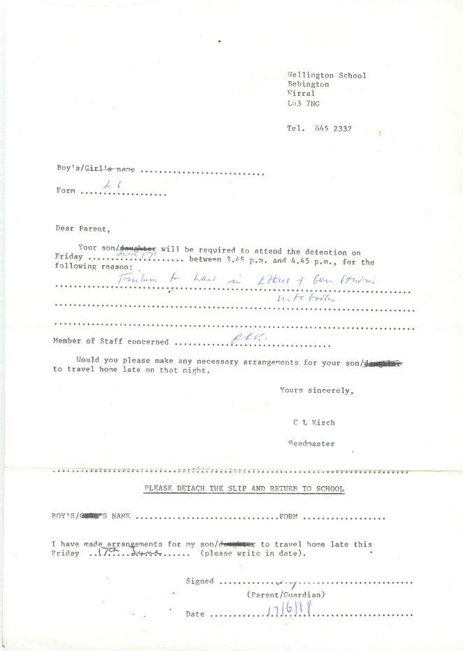 Letter sent to your parents when you had detention. Centre: Letter