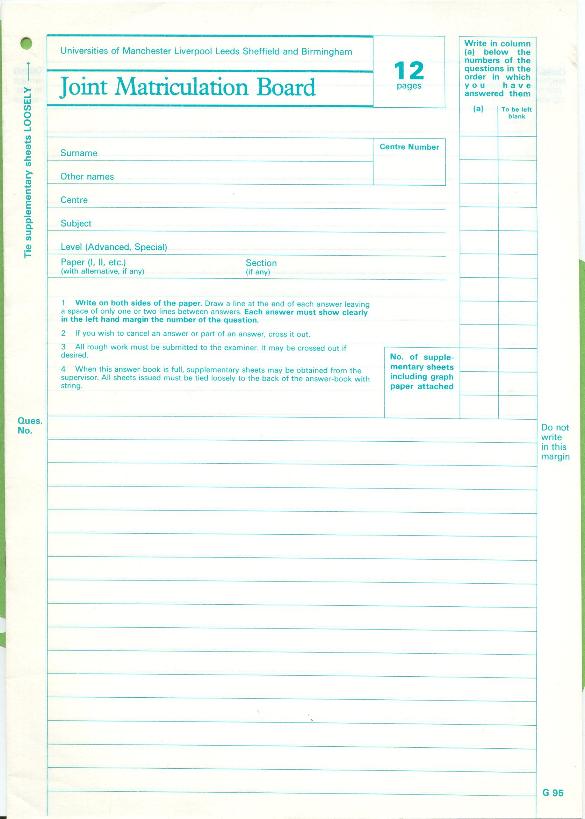 Reminder of the JMB exam front sheet (from 80's). Right: Record of a