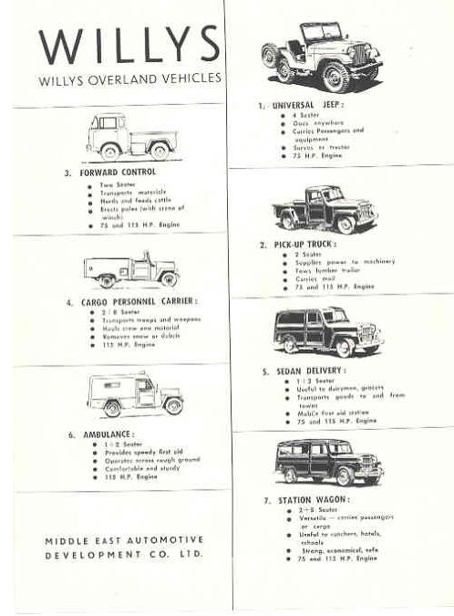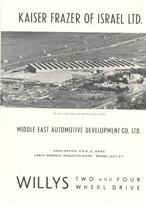 The complete model lineup. Note that there is hebrew writing above each of the vehicles names in English. Also note the Renault vehicles. What possible connection could this have to Kaiser Willys? Also note that it appears Kaiser and Willys produced all of the same cars that they did in America in Israel.