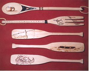 Here Are Some Off The Wall Things I Wanted To Work With. The Spoon Has A Couple Of Tomato's In The Center. The Fork Has A String Of Pees On It. The Paddles Have A Fishing Rod, A Two Person Paddle Boat, And A Very Angry Cat Fish. The Prices On These ($15.00 each)