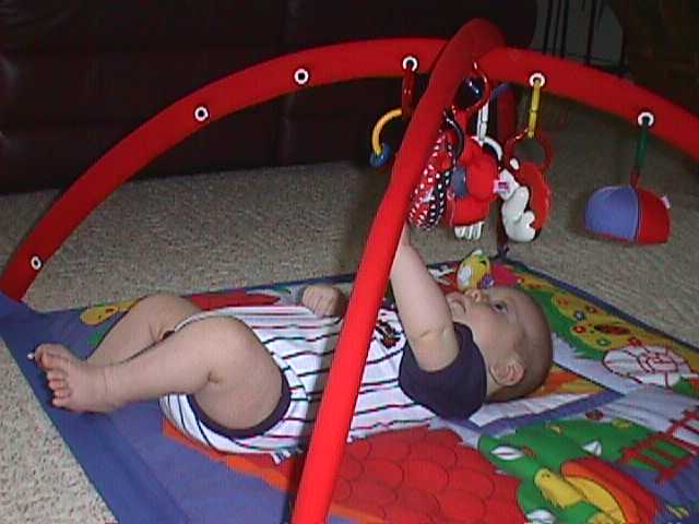 Mommy's friends Dawn and David gave us gift certificates to buy this gymini. It's my first toy. I really don't quite understand it yet, but it makes cool sounds and daddy likes to move the noise makers for me.
