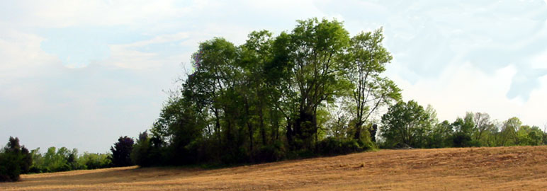 Terra Server provides searchable online satelite images. One image provides a look at the land where we believe Mount Moriah Methodist Church once stood. You will see Reed Mine Road making its hard bend to the north along the upper right hand border of the image. Hartsell Road dead ends into the bend and runs off towards the southwest. From metes and bounds found on the deed of land by William A. Burkhead to Jesse D. Cox, Old Mount Moriah Methodist Church once stood on two acres located on the east side of Hartsell Road about one hundred yards from the bend. Just beyond this site, a clearly visible dirt farm road turns off to the west. It runs west and jogs north before continuing west around a field. As the dirt road enters a narrow wooded area, the cemetery will be in the middle of a field just to the south. It appears as a small wooded lot with five sides. Running off to the east-southeast of the cemetery is a fence line dotted with cedar trees. And somewhere within 100 yards of the cemetery, James Adam Love stated that during his lifetime the remains of the old James Love home was still visible.