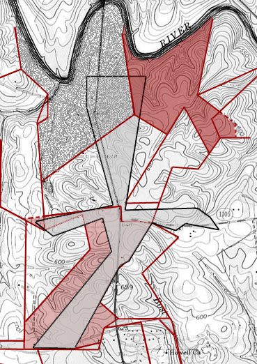 Concerning the darker red shaded area located on the south bank of Rocky River. Issued in 1814 to Silas Shinn and Samuel Morris, this tract overlaps Charles Dorton’s earlier grant (dark gray textured) and lies under his later grant (gray tinted). There is no later deed for this land in the name of Shinn or Morris