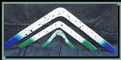 Novice to beginning throwers The "Spring Peeper" Never thrown a boomerang before? Here is a great Novice boomerang. Light, easy to throw, easy to catch Range 15-20 meters. does great in calm conditions. Takes some wind with a strong throw. click here for more Information 11.8 in tip to tip, 7.8 in high. Made from 4.5 mm, 6 ply finnish birch. 2 coats of Deft brand sealer on back, Krylon or equivalent on front. $12.00 + s&h. |