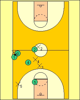 places to trap the ball before halfcourt.That way,you have a extra defender,the sideline out of bounds line.Here we have the point stuck at midcourt,with the clock running down.They will likely panic and throw a bad pass,and we will pick it off. If they try to pass to the sidelines tothe 5,our 5 should be close enough,to pick off the pass,or contain the player should the pass be completed. The 2 and 4 take away the center of the court. |