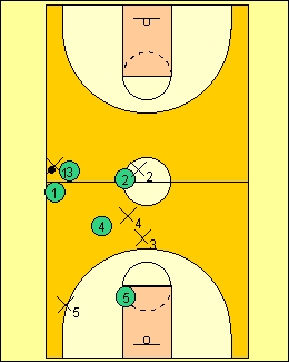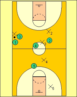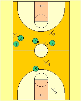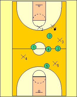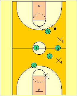 let your 2,4 and 1 players stay about halfcourt of maybe even a few steps behind.Stick your good 3 player 10 feet or so past midcourt line.The 3 waits on the ballhandler. The 5 stays around the free throw line or top of circle untill action get started. Each player has a job.I`ll describe them later as we go along.Each player must know their job well.You may give up a few easy baskets,don`t worry,keep the pressure up. |