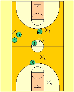 Bear in mind you have 10 seconds to get across midcourt,or 5 seconds after the offense stops dribbling.Hold them. Notice where the 5,4,and 2 are in relation to the ball and players. |