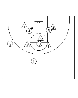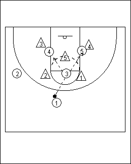 here is a example of a pass to the 3 who in turn looks to pass(quickly)to the 4 or 5.3 should use a "jump hook pass"The defensive 5 will probally be nearer to the 3.