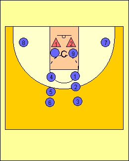 this drill helps with boxing out,rebounding,and outlet passes. 2 lines face hoop.Line 1 on the left,Line 2 on the right.One pair at a time then the other pair,example,first one in line one first,then line 2..The coach ( c ) has the ball to start off. The 2 red players are defensive players.The job of the defensive players is to block out the blue offensive players and get the rebound and pass it to the player on their side thats outside the lane. example = 2 passes to 7.. The job of offensive players is to rebound and shoot it back up and score. The play starts when the coach throws the ball up and off the backboard for the players to rebound. here`s the player rotation; offense,defense,outlet then get in back of offensive lines. Teaching Points:Defense: 1-stay low and wide with fet wider than shoulders for good balence and in a half crouch or half sitting position. 2-use their legs,rear end,body to contain man,no hands 3-attack the boards contain your man,see the ball,explode up,grab the ball and while landing be looking for the outlet man to pass to quickly. Offense; 1-be aggressive 2-anticipate the rebound figure the shot will be missed and allways look for a rebound. 75 % of all shots go long.. 3-Power the ball back up |