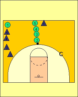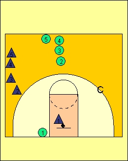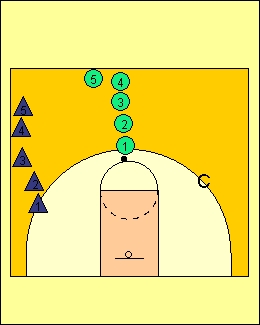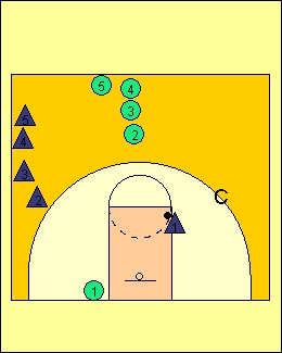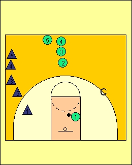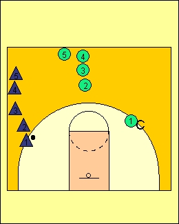 the 1 passes off breaks hard to the cone and then breaks hard for the basket to recieve a pass back from team mate for a layup or shot.