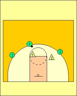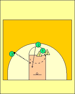 This drill uses a pass and a screen to help get a team mate open for a close shot. 3 offense players and 2 defense play m2m the 1 passes to the 3,and then the 1 screens for the 2 to roll around the screen to the basket.The timing for the 1 and 2 to began moving is important,move at same time. |