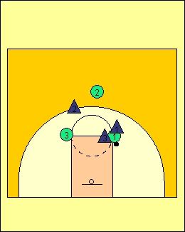 the 3 has the ball here and is being pressured by 2 defenders.The lone defender is "splitting the 2 offensive players expecting to go any way quickly. Make them do this and close out fast and good.Make it a habit with them so they don`t have to think,just do. |