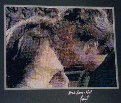 This picture of Nick and Nat from "Night in Question" was stitched by Michelle Loo. She got it autographed at Gerthering 4 as well. Note: It says "Nick loves Nat." {grin}