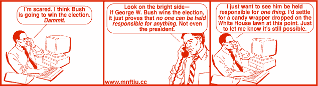 Losing sucks. Republicans control just about every function of government right now. But I'm trying not to be too discouraged here. 48 (ed.'s note- actually 55.5) million people voted for Kerry, and despite what right-wingers might try to tell you about a mandate, that's a hell of a lot of people who stood up for their beliefs when it mattered. Just got to take this in stride like any other setback. Like young Indy was told in the Last Crusade, "You lost today, kid. But that doesn't mean you have to like it."