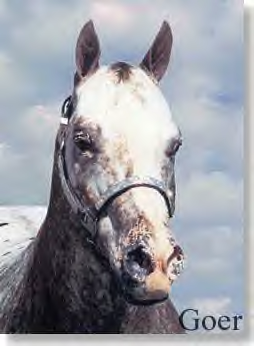 GOER![]() Breed: ApHC #T180530 Foaled: April 13, 1973 Died: August, 1994 Color: Chestnut Goer Story From the time Tom Simmons of Herald, California, saw Goer, he knew he had to have the colt. Goer, foaled April 13, 1973, was purchased under the condition that Simmons would actively promote the loud-colored youngster by Go Bay Go and out of Miss Bar Heels (AQHA). Simmons brought Goer, along with the colt's dam, to his Herald, California, ranch where he began preparing Goer for competition. Goer's first year on the show circuit was nothing less than exceptional. With George Minic leading, Goer won his class at the Denver Stock Show and went on to win the Southwestern International, the California State Fair and the Grand National Livestock Show. His two-year-old season was just as impressive, standing grand champion at the Wyoming State Fair, GEAR, Kansas State Fair, Tulsa State Fair, Mid-Con, Chicago International and Grand National Shows. Goer continued to win big his three-year-old year, logging championship stallion honors at the Fort Worth, San Antonio and Houston Livestock shows, and with reserve honors in Denver. With Ted Turner leading, Goer wrapped up the National Show three-year-old stallion championship in time to return home and finish his breeding season. 1976 also marked a turning point in the management of Goer. Simmons was able to devote his efforts full-time in the horse business, and Dick Kennedy purchased half interest in Goer. This was the beginning of Simmons-Kennedy Ranches. Unfortunately, Kennedy's wife was diagnosed with cancer, and although he maintained an interest in Goer, Simmons became Goer's primary manager. Within two years, business was booming at Simmons-Kennedy Ranches. Goer had made a name for himself as a premier sire due to the success of National Champions Gojak, Tony Lama and My Daddy's Tuff. We just started raising National and World champions," Simmons said in a December 1993 Appaloosa Journal interview. "It wasn't unusual to get two, three, four World or National champions at one show. Of course the breeding contracts just rolled in. It wasn't long before Goer's popularity was growing faster than Simmons could keep up with. Simmons soon realized that by selling Goer's get, rather than showing them himself, he could supply the demand for Goer's colts, and he didn't beat the competition -- ultimately potential customers. In 1980, 1983 and 1984 Goer won the National Show's get of sire class and both the National and World Show's titles in 1985. "...for years we had more business than we could handle and in the horse business, that's quite a position to be in," said Simmons in the 1993 interview. But in 1994, just as a new partnership was developing between Simmons and Jim and Karol Nylund, who had replaced Dick Kennedy, disaster struck. Goer broke his leg in a breeding accident. While teasing a mare, who was safely within the confines of her stall, Goer reared back when the mare kicked out. The mare never made contact with Goer, but his reflex reaction resulted in his left front leg nicking a feeder. "It must have been the angle of the impact, not the force that was responsible," said Simmons in a November 1986 Appaloosa Journal interview. "The wound was just a little cut about an inch long and not even deep enough to bleed." However, x-rays revealed that Goer had sustained a 5-inch long diagonal and vertical hairline fracture. He was given a 50 percent chance of recovery. Confined to his stall for eight weeks with his leg immobilized, Goer's breeding season had to be cut short, but this was a small price to pay for the full recovery of this influential stallion. The confinement was followed by an exercise program to rebuild Goer's muscle tone and stamina. Goer stood at Nylunds' Rainbow Ranch in Colorado until 1992 where he continued to sire winning get. He was then sent to Dennis and Mary Lynn O'Leary's in Illinois where he stood his last season. Some of Goer's most influential get include Goever, King Goer, Go-You-Er, Go For Me, Foers DBL Bright and O'Hara -- all Appaloosa Horse Club champions -- and She's Awesome and Spec-To-Go -- Appaloosa Horse Club champions and versatility champions. In all, Goer sired 722 registered foals, earning himself the title of all-time leading sire. A leading sire of medallion winners by age 10 and a bronze medallion winner himself, his progeny have won more than 48 bronze, two silver medallions and 180 ROMs. In 1995, Goer joined The Executive, Rock Star and Roman's Straw Man to become one of only four stallions to ever receive the Appaloosa Horse Club's peformance sire award. At that time, Goer's get had earned more tha 7,300 halter points and 1,600 performance points. Simmons said in the November 1986 interview following Goer's accident, "We just hope that when his time does come, it's the result of old age -- not an accident -- and that by then he will have made an incredible mark on the Appaloosa breed and be respected and remembered long afterwards." Goer's impact on the breed has far exceeded all of Simmons' expectations and the influence this great stallion continues to exude is legendary. In August of 1994, at age 21, Goer passed away due to natural causes at O'Leary Farms. He was inducted into the Appaloosa Horse Club Hall of Fame in 1994. {This article, by Robin Hirzel, and accompanying photograph were originally published in the Appaloosa Journal, December 1997, Vol 51, No.12, "Legends Goer Love at first sight" and are used here by permission.} Copyright © 1997 Appaloosa Horse Club. All rights reserved. Hidden Oak Ranch Home Page