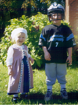 (No, my son is not wearing his faire costume!!! :-) This is their Halloween picture.) My daughter is wearing her pink gown in this one, over the kirtle and chemise. The front of the skirt has lace and ribbon on the inside edge which is turned back and held in place with safety pins underneath. I sewed a string of fake pearl looking things around the neckline and did some blue embroidery around the arm holes. These trimmings are not exactly historically accurate (especially not for peasants!!) but I wanted to make her outfit pretty since it was also her Halloween costume.