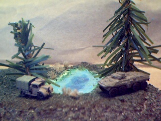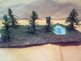 The trees are made from Christmas garland. The miniatures shown for scale are made by GHQ and In Service Miniatures.