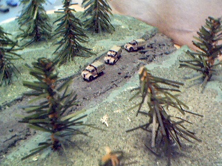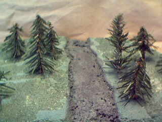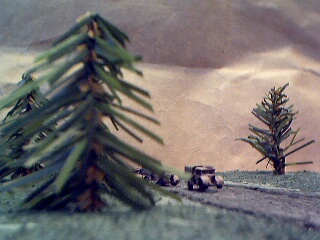 The base was left over from another project I was working on and I had a bunch of trees already prepared so I thought about doing a forest base. In the games I play though, most figures cannot traverse a forest area. So being inspired by something I had seen on another web site (if only I could remember which) I decided to put a road through the forest, giving vehicles cover while allowing them trough the area.