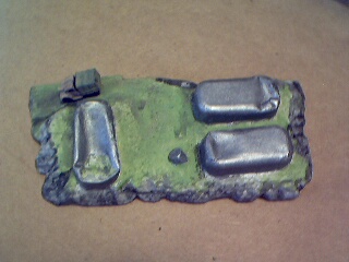 This project started with the plastic blister packaging that came off a GHQ pack of five vehicles. As I was assembling the models I was looking at the packaging while the glue dried (Okay, okay, I was driving them around making motor noises... ;-) and realized that they were the size of small bunkers or hardened storage sheds. So I grabbed a scrap of Styrofoam and cut out a base. I wanted room for a miniature to be within the storage area so I only used three of the five blisters.