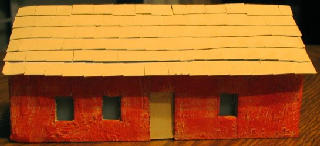 After contemplating various methods for making a roof, I decided to attempt shingles. I cut cardboard from a cereal box in to half-inch strips. Then I notched the strips along the long side nearly all the way through to make the shingles. I compared each new strip with the previous so the shingles would overlap. Finally I glued the strips together so that the top one overlapped the uncut portion of the strip below it. I made each side of the roof separately and then glued them both to pieces of corrugated cardboard strength. The cardboard had already been glued together at the correct pitch for the roof. I covered the ridge of the roof with individual pieces of cardboard to finish it off.