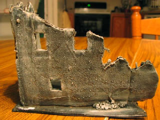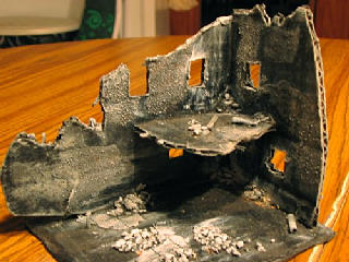 The one thing you may notice about the ruins, especially the ones below, is that the currugations tend to be very noticable. I normally do cover the edges with masking tape (as I did with the undamaged buildings), but on these I chose to avoid the hassle of taping the ragged edges, though I do tape the corners. That is probably the main disadvantage of using cardboard -- it's a trade off between time/cost and looks. These are meant to be cheap and fast.