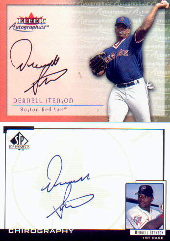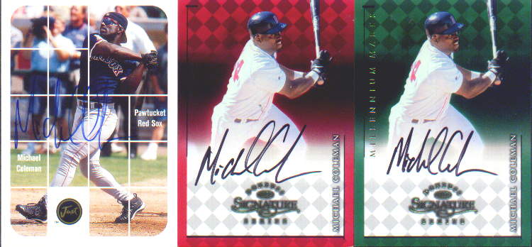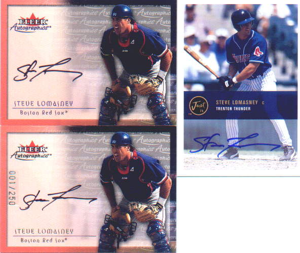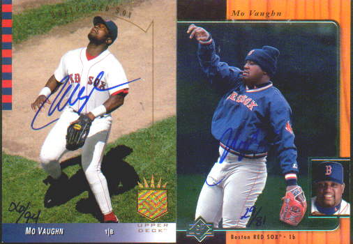 I have certified autographed cards from packs of Bill Haselman, Mike Stanton, Mo Vaughn(2 different), Fred Lynn, Dennis Eckersly, Bobby Doerr, Adam Everett, Troy O'leary(2 different), Shea Hillenbrand(4 different), Donnie Sadler(3 different), Mike Stanley, Jeff Suppan(3 different), Jamie Moyer, Reggie Jefferson(3 different), Carl Pavano, Chad Renfroe, Michael Coleman(3 different), Dernell Stenson(2 different), Steve Lomasney(3 different), Brian Rose(2 different), Wilton Veras, Casey Fossum, Trot Nixon, Bobby Thompson, Luis Tiant, Jim Lonborg, Rick Asadorian, Jason Sekany and Tomo Ohka all pictured with Red Sox or Minor League affiliates. I also have autographed cards of Darren Bragg, Darren Lewis, Rheal Cormier and Damon Buford with other teams.