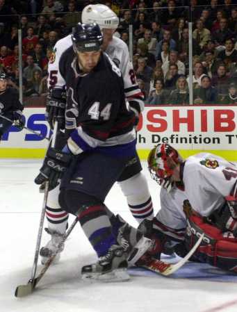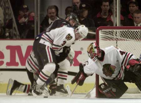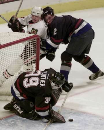 Thibault steers the puck with his stick as Karpovtsev clears Bertuzzi out of the crease..