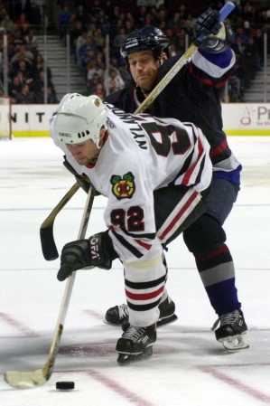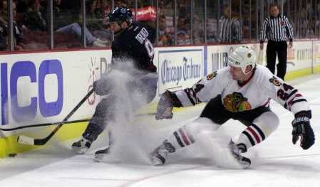 Vancouvers Druken along the Boards Chasing a puck while Probert gets low for a fast stop.